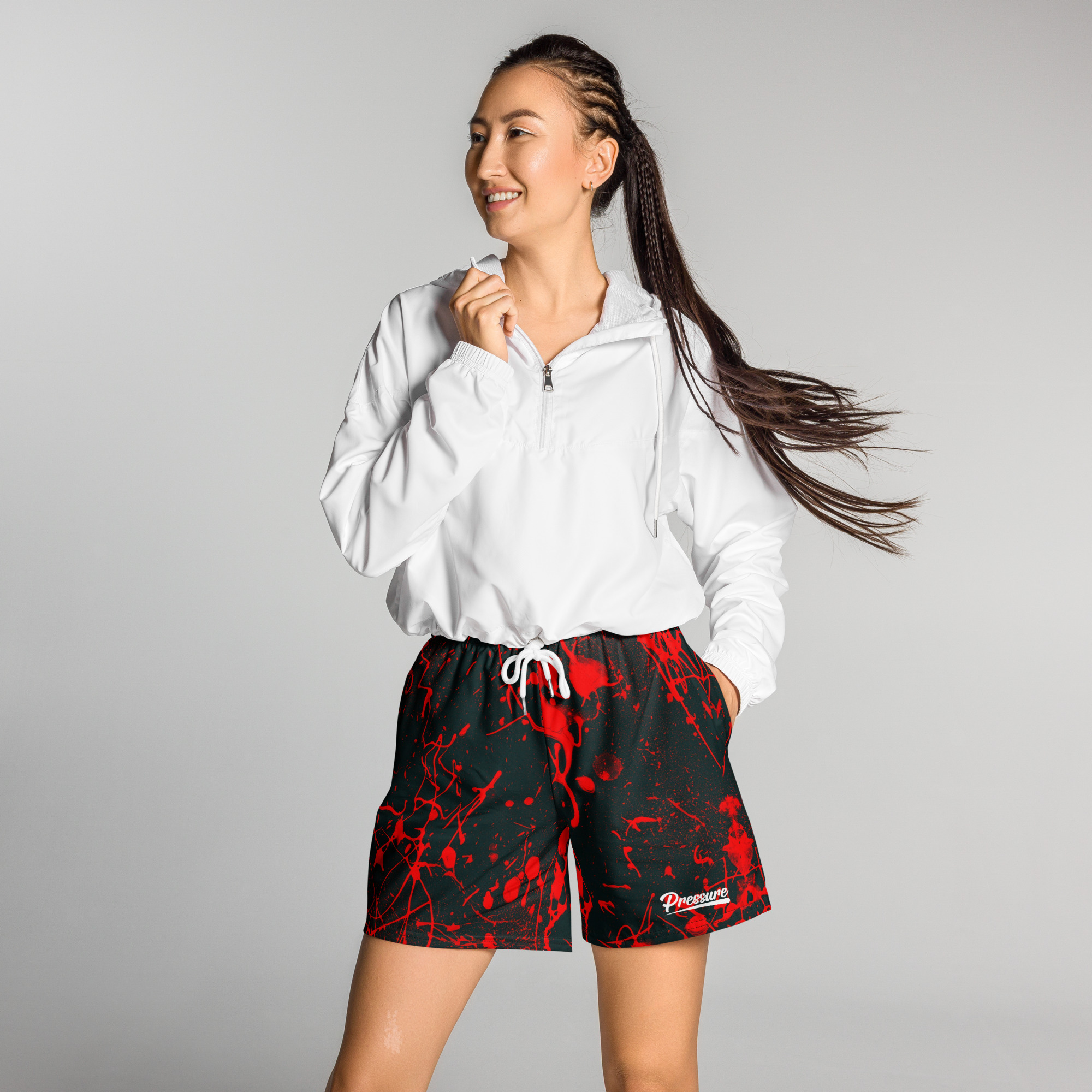 • Elastic waistband with a flat white drawstring