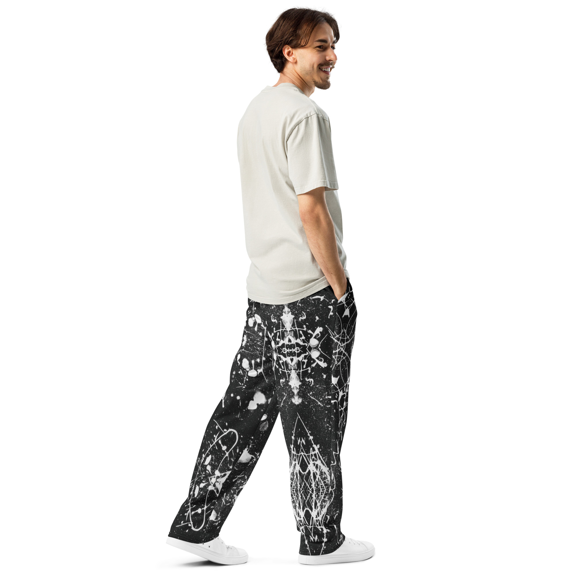Rediscover ’90s fashion with these all-over print wide-leg joggers. Ideal for athleisure looks and casual outings, they offer a unisex fit and handy side pockets.